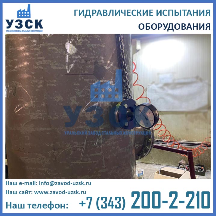 Уральский завод стальных конструкций проводит гидроиспытания и опрессовки различного оборудования и изделий, таких как работающие под давлением сосуды и аппараты (резервуары, емкости, баки, фильтры, теплообменники, подогреватели, сепараторы, котельное оборудование и т.д.), трубопроводы различного назначения (для пара, воды, нефти и нефтепродуктов и пр.), трубопроводная арматура (задвижки, грязевики, компенсаторы и т.п.). По результатам испытаний выдается заключение. Мы проводим гидравлические испытания как на собственной базе, так и на вашем объекте при помощи мобильный гидростенда.